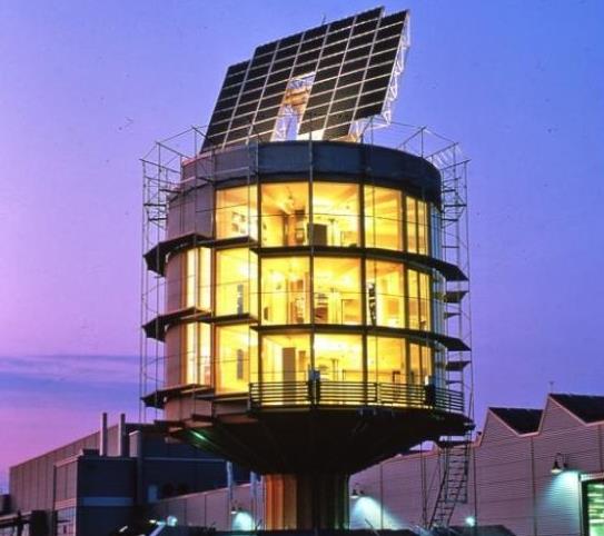首先是由德国设计师Rolf Disch设计名叫Heliotrope的太阳能建筑,Heliotrope是世界上第一个采用“积极能源”的房屋,并且可以产生比日常用电量多五倍的太阳能电量。在Heliotrope顶部排列了巨大的太阳能电池阵列,并且整个结构可以180度旋转,始终对着太阳的方向收集能源。