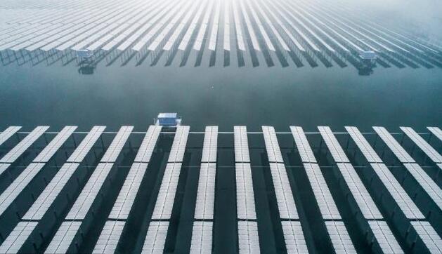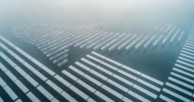 雪后的江苏泗洪光伏发电应用领跑基地银装素裹,一排排整齐有序的光伏电路板在白雪的覆盖下与碧绿的湖水相互映衬,蔚为壮观。