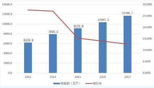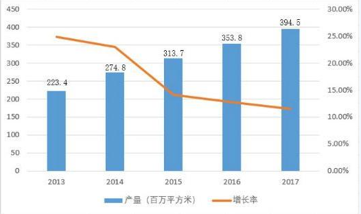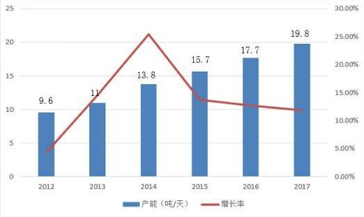 如图为我国近五年来光伏玻璃国内销售额及其增长率,有图可知,近五年来,光伏玻璃的销售额稳步增加,从2013年的6228.9百万元增加到2017年的11706.7百万元,销售额接近翻了一倍。除此之外,每年增长率保持平稳,近五年来的平均增长率为19.29%,近五年的光伏玻璃行业平稳上涨。