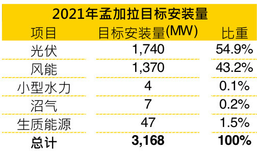 孟加拉政府在2021年愿景计划(Vision 2021)中订定3,168MW的再生能源目标安装量,届时预计能满足国内10%的发电量,其中推动的项目着重在光伏和风力,两者分别订定1.74GW和1.37GW的目标。