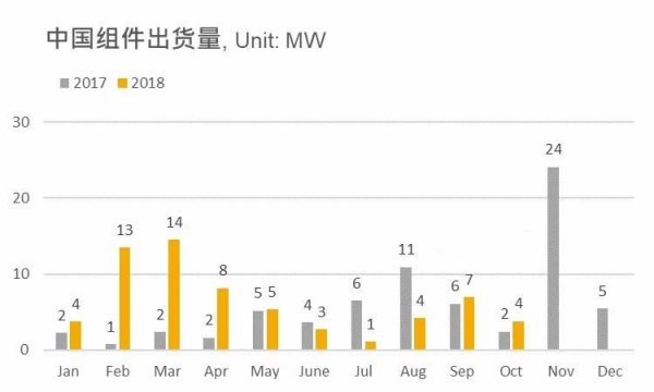 根据PVInfolink海关数据数据库显示,中国组件出货至孟加拉的需求量不大,2017全年的组件出货量仅71MW。2018年1-10月出货量为64MW,和去年同期相比成长52%,虽可预期2018年市场需求相对2017年较高。但对于要满足每年约471MW的需求仍是远远不及的。