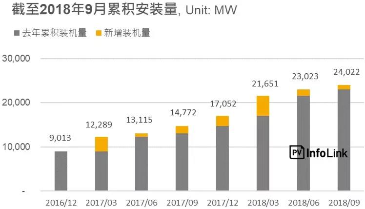 在总理莫迪上任以来积极推动光伏发展之下,目前印度已成为全球前三大之一的光伏市场,截至2018年9月,印度光伏累积安装量已达24GW,今年(2018)1-9月共计新增6.97GW和去年同期新增约5.76GW相比,安装量成长率达21%。