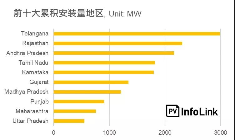 印度各邦光伏发展程度不一,多数电站项目集中在特定区域,截至2017年年底印度总计37个行政区累积安装量达17GW,其中前十大安装量邦为Telangana, Rajasthan, Andhra Pradesh, Tamil Nadu, Karnataka, Gujarat,Madhya Pradesh, Punjab, Maharashtra, Uttar Pradesh,合计累积安装量达15.8GW占据了高达90%以上的总体安装量。