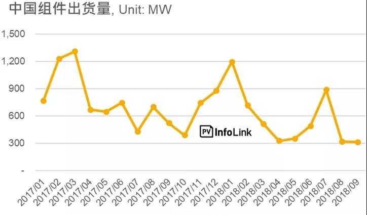 去年(2017)四季度需求又再度攀上了高峰,然而今年四季度的组件需求预期将不会和去年同期一样有明显的需求成长,而是预计将维持9月份较为低迷的需求走势,原因在于印度保障性关税Safeguard在7月30日起实行,受到保障性关税影响,今年(2018)8月的需求已经迅速冷却,反映政策的冲击力道,但预期明年一季度仍会有一定的拉货力道。