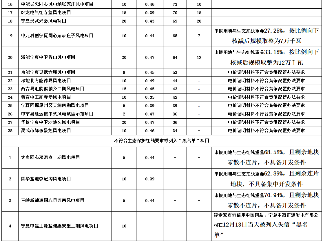 风电“竞价”结果共涉及32个风电项目,其中,4个风电项目不符合生态保护红线要求或列入“黑名单”;28个风电项目均以“承诺电价”方式获取评优排名。