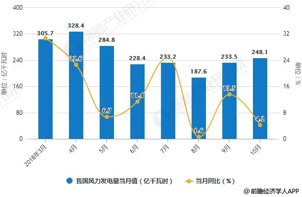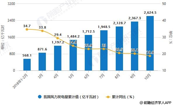 近年来,我国可再生能源发展驶入快车道,以风电为代表的新增主力发展势头强劲。据《中国风电行业市场前瞻与投资战略规划分析报告》统计数据显示,2018年前三季度,全国风电新增并网容量1261万千瓦,同比增长30%,风电累计并网装机容量达到1.76亿千瓦。风电装机规模稳步扩大的同时发电量也在不断攀升。据前瞻产业研究院数据,2018年1-10月份全国绝对发电量55816亿千瓦时,其中2018年10月我国风力发电量达到248.1亿千瓦时,同比增长4.2%。2018年1-10月风力发电量累计达到2624.5亿千瓦时,累计增长18.8%。占全国电源总发电量的4.7%,风电正在不断地巩固我国第三大主力电源的地位。