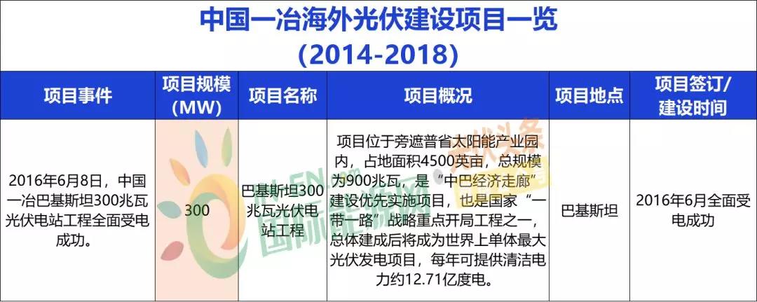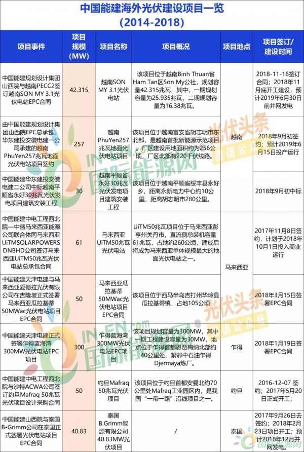 截至目前(2014-2018年间),中国能建、中国电建、国家电投、中广核、南方电网等9家能源央企先后在越南、马来西亚、泰国、约旦、乌克兰、巴基斯坦、尼泊尔、土耳其等一带一路国家集中开展光伏项目建设工作,近30个项目,总规模3.56GW,有效提升了一带一路沿线国家能源太阳能资源开发的能力和水平。