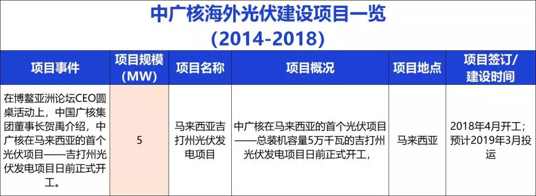 在今年4月举行的博鳌亚洲论坛CEO圆桌活动上,中国广核集团董事长贺禹介绍,中广核在马来西亚的首个光伏项目——总装机容量5万千瓦的吉打州光伏发电项目日前正式开工,预计2019年3月投运。