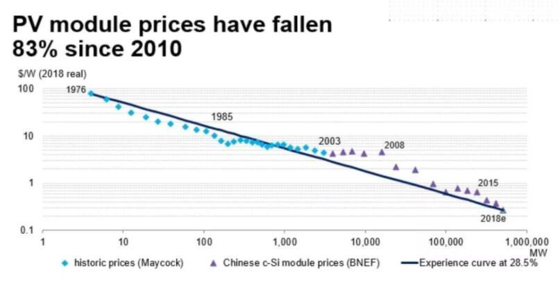 据BNEF数据曲线,光伏组件自2010年来价格降幅已达80%