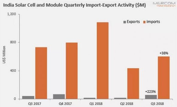 来自印度Mecrom的报道,根据印度商务部最新数据,2018年第3季度进口的光伏组件和电池价值约6.02亿美元。相较第2季度的4.3663亿美元,这一数字增长了约38%。但是与去年同期相比,则下降了约17%。