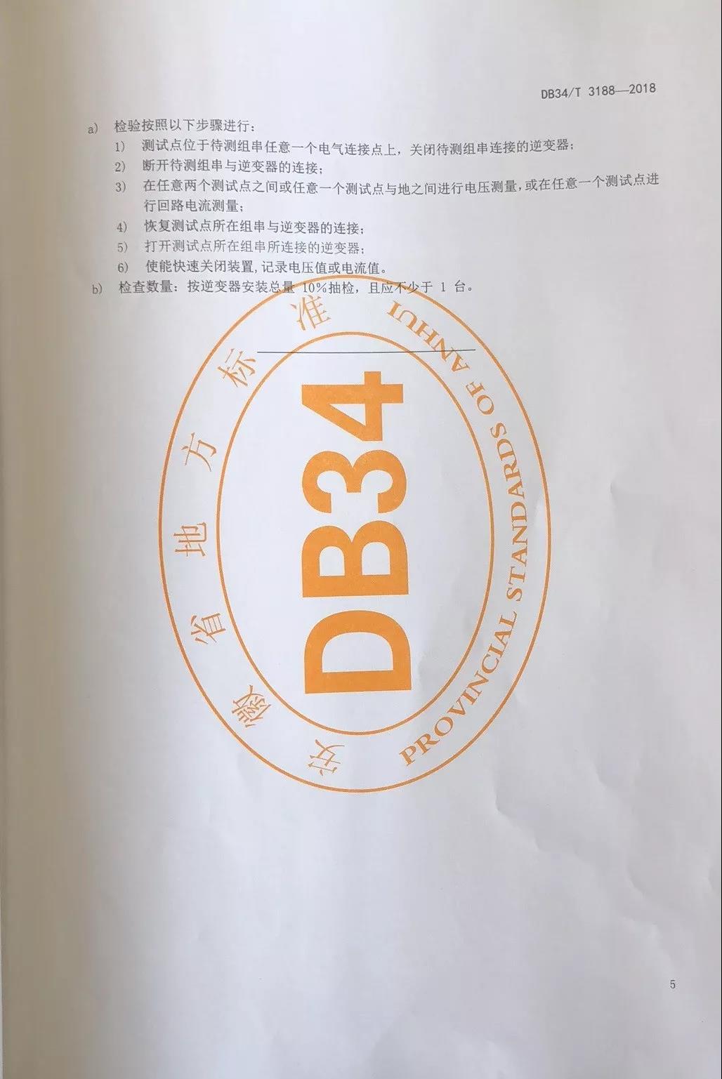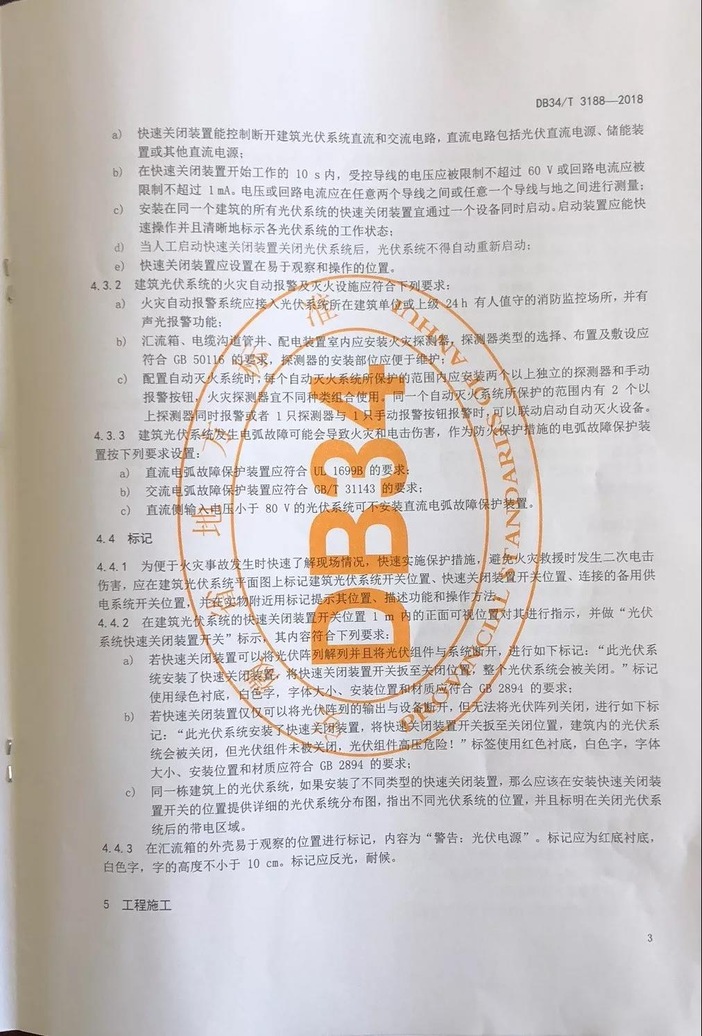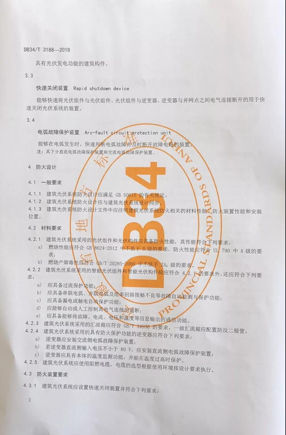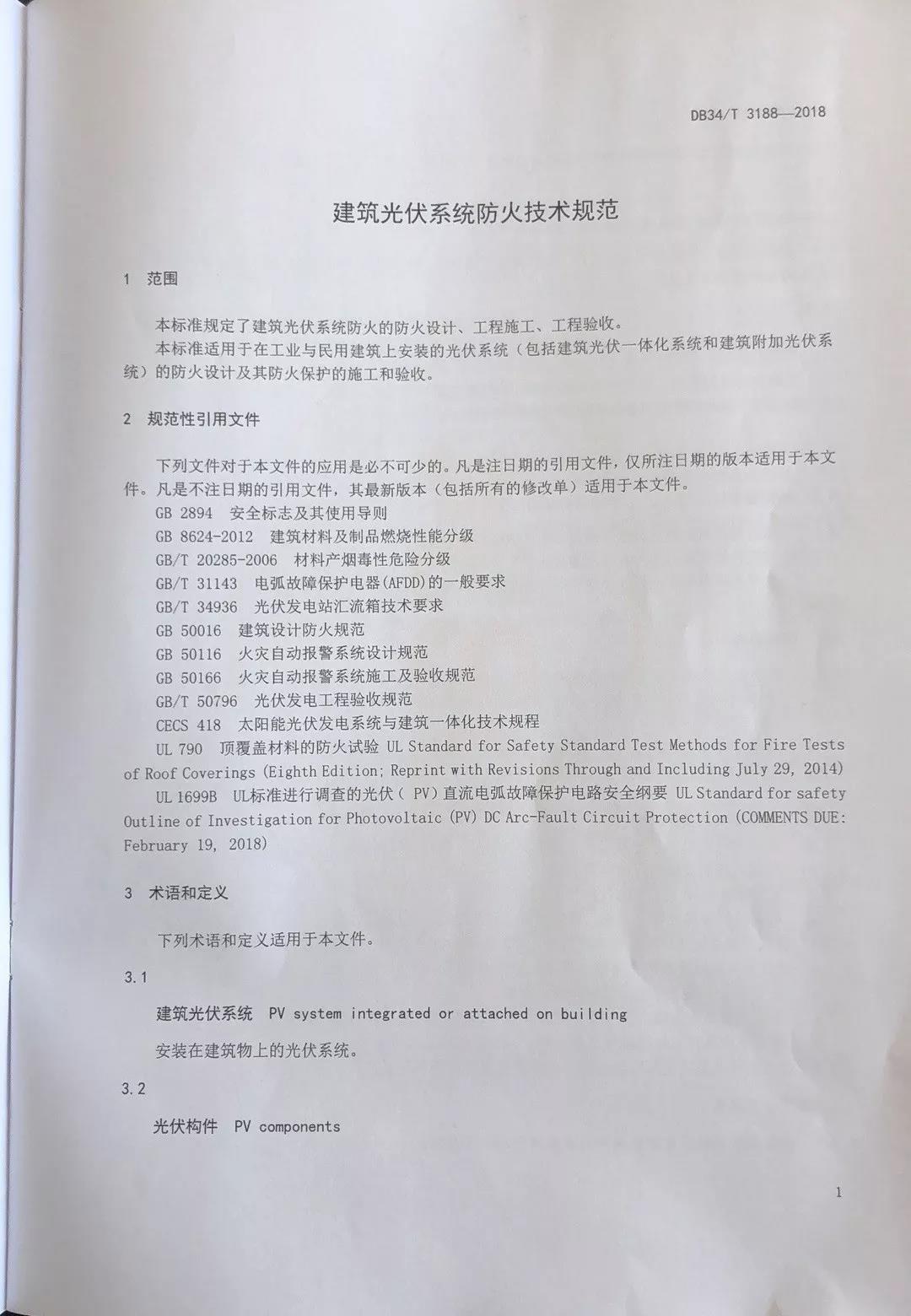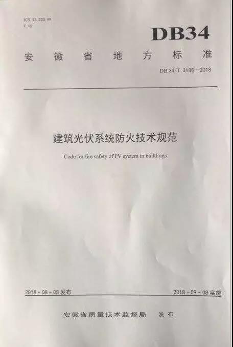 近日,安徽省质量技术监督局对外刊发了地方标准《建筑光伏系统防火技术规范》(DB34/T 3188-2018)的正式文本。该标准是国内首个关于建筑光伏防火技术规范方面的标准,由安徽省公安消防总队组织编写,于2018年8月8日发布,9月8日开始实施。