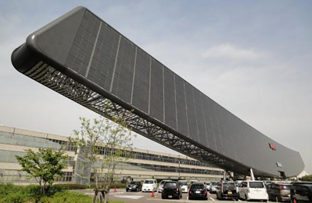 日本Sanyo太阳光电公司运用简单的建筑意象设计,以圣经上的“诺亚方舟”神话为原型,由5046块黑色太阳能电池板组成,远远望去就像巨大船只飘在空中,简直就是光伏与建筑相结合的一件艺术品。