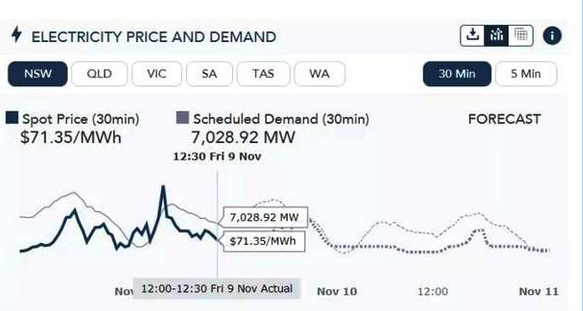 登录澳洲电力监管网站可以查看到各个州的实时电价以及电量需求。