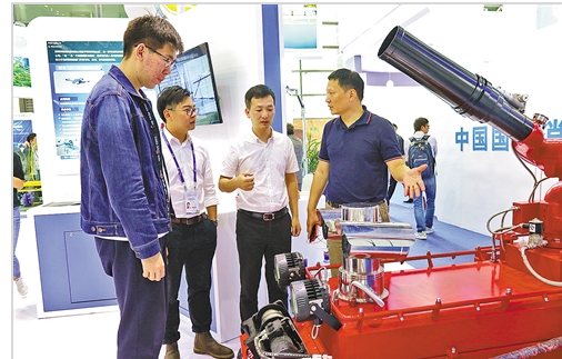 图为参展商(右一)在向来宾介绍机器人技术特点。