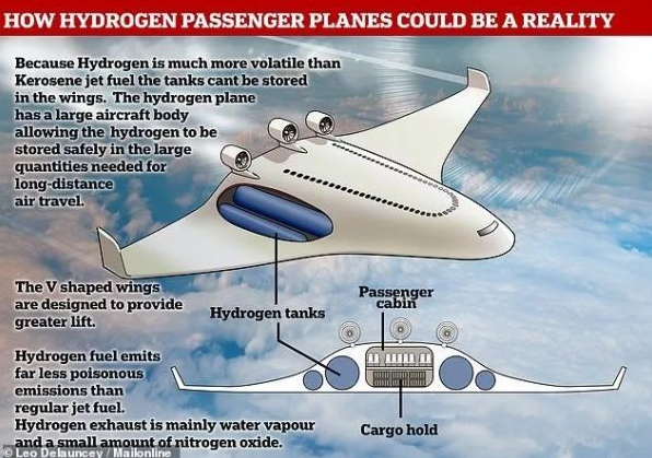 与传统飞机不同,这种v型飞机将使用更清洁的液态氢作为动力,二氧化碳排放量为零。
