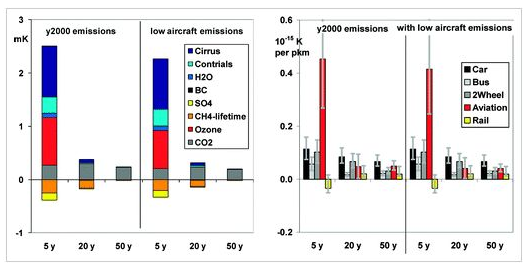(左图代表的是2000年飞机的排放经过5年,20年,50年以及削减的飞机排放对于全球大气的影响的示意图。右图中,飞机的排放的气候效应远远大于其他的交通工具)