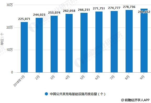 据前瞻产业研究院发布的《电动汽车充电桩行业发展前景预测与投资战略规划分析报告》统计数据显示,2018年9月公共充电基础设施增速平稳。截至2018年9月,联盟内成员单位总计上报公共类充电桩28.5万台,其中交流充电桩12.6万台、直流充电桩9.7万台、交直流一体充电桩6.1万台。2018年9月较2018年8月新增公共类充电桩5916台。从2017年10月到2018年9月,月均新增公共类充电桩约7841台,2018年9月同比增长49.4%。未来两年,充电桩建设速度还将继续加快。