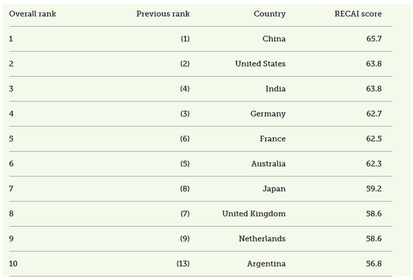 由于对英国脱欧的担忧,中国和美国在40强排名中保持了第一和第二的位置,而英国从第七位下滑至第八位。在英国,英国脱欧对欧盟电力出口和进口设备价格影响的担忧导致第三季度可再生能源投资同比下降46%。