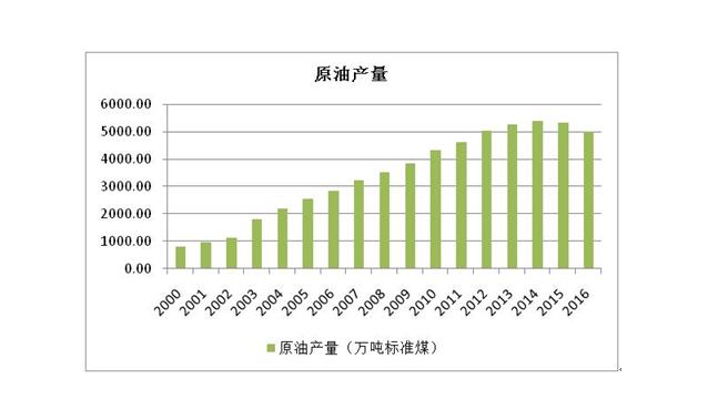(2)原油产量小幅增长。长庆油田公司和延长油田公司是我省的主要产油企业,在两大油田稳产的带动下,2000年以来我省原油产量保持平稳增长。原油产量从2000年的808.3万吨标煤增长到2016年的5003.57万吨标煤,16年增长5.2倍,我省原油产量呈现快速增长态势。从增速来看,2014年以前原油产量基本保持稳定正增长,2014年国际原油价格大幅下降,对我省石油工业产生较大影响,原油产量增速开始回落,原油产量从2014年的5382.69万吨标煤下降到2016年的5003.57,产量下降7%。