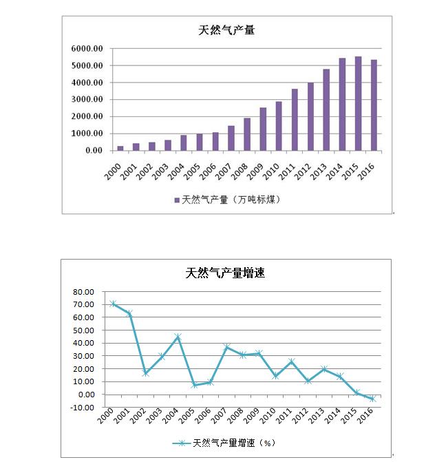 (3)天然气保持快速增长。“十五”以来,我省天然气产量保持高速增长,对我省发展清洁能源,改善能源结构具有重要作用。2016年全省天然气产量5345.34万吨标煤,比2000年增长近20倍,是我省增长最快的能源品种。总增速看,我省天然气波动较大,但总体来看,增长速度呈下降趋势。2000年最高,增速达到70%,随后震荡下行,2015年后增速下降至个位数,2016年增速进一步下降至-3.4%,首次出现负增长,我省天然气产量相对处于稳定阶段。