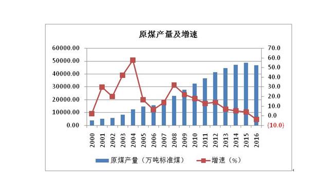 (1)煤炭产量显著增加。煤炭继续发挥支撑我省经济持续发展的重要作用,煤炭产量显著增加。从总量来看,2000年以来,我省继续发挥优质煤炭资源优势,原煤产量不断增加,2016年我省原煤产量51566.15万吨,是2000年的13.2倍,年均增长17.5%。从各年的增速看,受宏观经济形势和煤炭价格影响,原煤产量增速先升后降。2000年——2012年我省原煤产量增速保持快速发展势头,增速基本保持在两位数以上增长,2013年后增速开始下降至个位数,2016年降至历史低点,出现负增长,增速达到-3.7%。