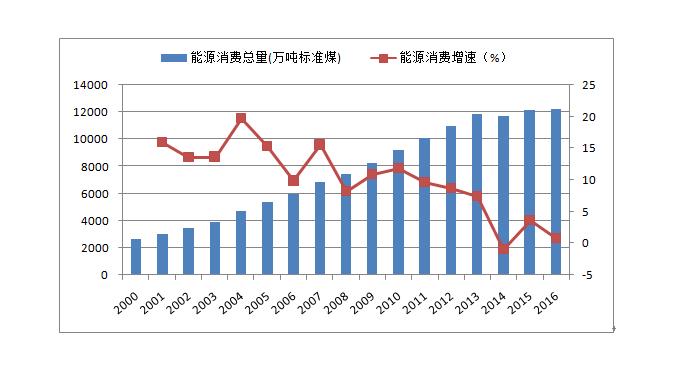 从各年数据特点看,2000-2016年大致可以分为三个阶段,2001-2007年,能源消费总量相对较低,但增速处于高速增长阶段,各年增速均保持两位数的增速;2008-2013年,能源消费增速处于中等速度阶段,在10%左右波动;2014-2016年,能源消费增速较低,呈下降趋势。
