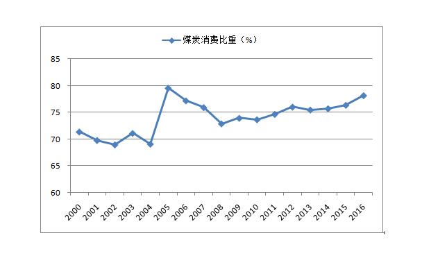 (3)能源消费仍以煤炭为主。我省煤炭资源丰富,长期以来,煤炭一直是我省的主要能源消费品。短期内,这种格局未发生较大改变,煤炭占能源消费总量的比重一直在七成以上。为加强我省煤炭资源就地转化,2003年以来,我省电力、热力的生产和供应业,化学原料和化学制品制造业投资增长较快,随着高耗煤项目的投产,2005年我省煤炭消费大幅增长,占能源消费总量的比重由2001-2004年的70%左右(当量值),迅速上升至80%。2006-2008年,煤炭消费占比虽有下降,但保持在高位,2009年后,占比逐渐上升,2016年达到78.2%,比2000年上升6.9个百分点。总体来看,煤炭消费占比呈现上升趋势。