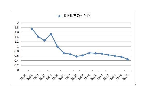(2)能源消费弹性系数不断下降。能源消费弹性系数是能源消费增长速度与国民经济增加值增长速度的比值,系数越小,能源利用效率越高。2000年以来,我省能源利用效率逐渐提高,能源消费弹性系数不断下降。2016年能源消费弹性系数为0.45,比2015年下降0.11,比2001年下降1.3,从各年的数值看,能源消费弹性系数不断下降。