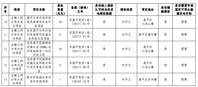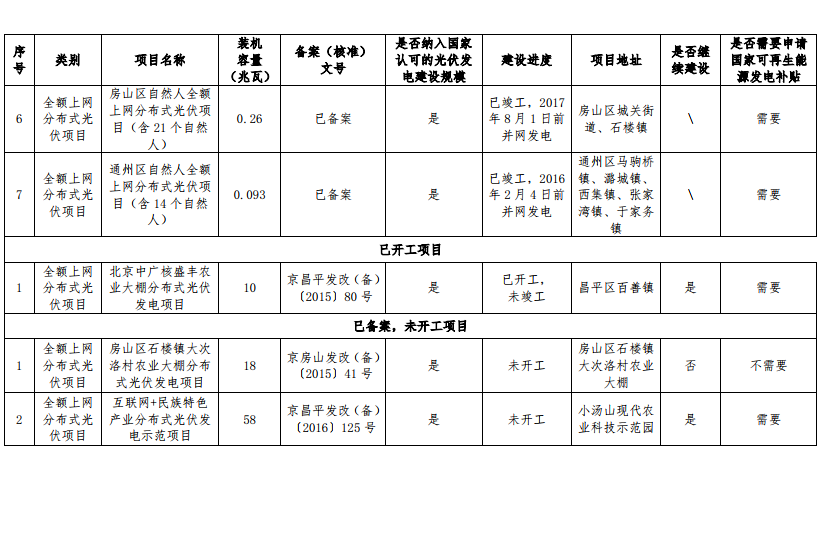 通知指出,根据国家能源局综合司《关于梳理“十二五”以来风电、光伏发电项目信息的通知》要求,北京市发改委会同各区发展改革委和相关单位对本市“十二五”以来风电、光伏发电(全额上网类)项目情况进行了梳理,现按通知要求对项目情况进行公示。