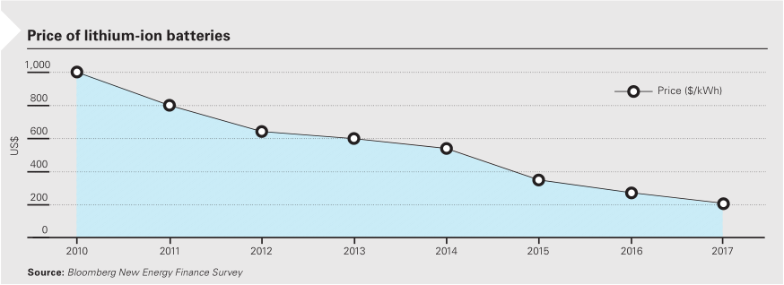 除了电池储能领域的改善,工业领域的发展也进一步促进了电池储能价格下降趋势。近年来电池储能价格明显下降。其中部分原因来自于规模经济的实现,尤其是电动汽车制造商领域。穆迪公司目前预测,到2020年,锂离子电池的成本将从90年代初的每千瓦10000美元降至约每千瓦100美元。