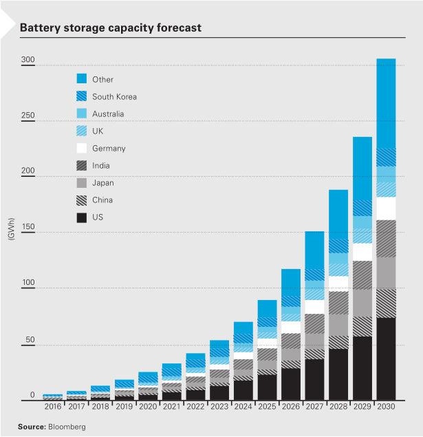 彭博社预计,到2021年,全球电池年均安装量将达131GWh,而制造能力将增长至每年400 GWh,到2050年将产能将进一步增加1291 GWs。一些评论家猜测印度将成为重要的制造中心。