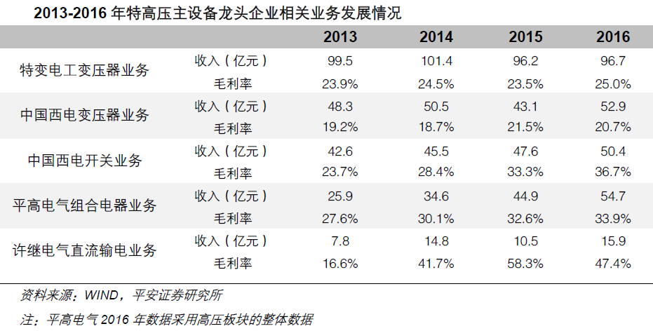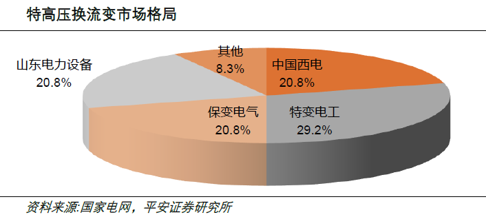 我国特高压设备企业已形成自具备主知识产权的研发体系和核心制造能力,设备国产化率达到90%以上,特高压交流电压成为国际标准。我国领先于国外电工装备企业在1000kV特高压交流GIL管廊、1500MVA特高压变压器、±800kV、±1100kV特高压换流变、换流阀、穿墙套管等设备领域取得率先突破。特高压交流中的关键设备是变压器和GIS,特高压直流关键设备主要包括换流变压器,换流阀,控制保护系统和平波电抗器等。特高压主设备产品技术门槛高,市场集中度高,主要的参与企业包括国电南瑞、平高电气、许继电气、特变电工和中国西电等。