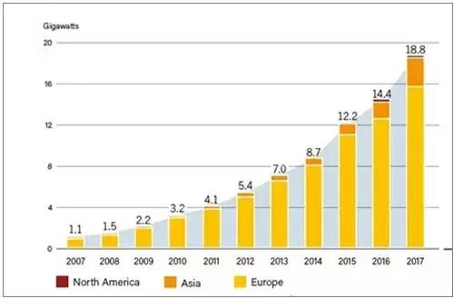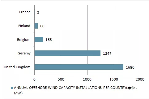 2017年欧洲投产的海上风电总装机容量中,有一半以上(53%)来自英国。德国为第二大市场,拥有欧洲总容量的40%;比利时占总份额的5%;芬兰启用了首个海上风电场。