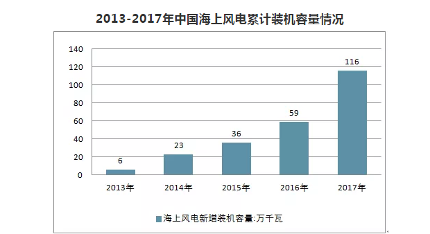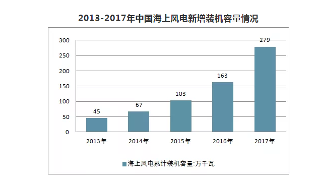 进入“十三五”以来,我国在《十三五电力发展规划》以及《十三五能源发展规划》等多个规划文件中对海上风电行业提出规划,海上风电的重视程度大幅提高。在政策支持下,我国海上风电取得突破进展。数据显示,2017年海上风电新增装机容量达到116万千瓦,同比增长96.61%;累计装机达到279万千瓦,同比增长71.17%。