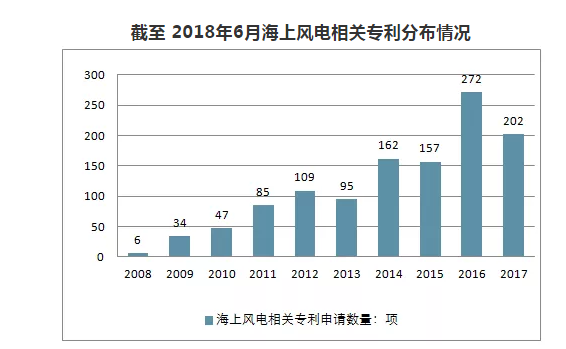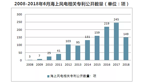 从公开专利数量来看,2008-2017年,我国海上风电专利公开数量总体上呈趋势。2017年,我国海上风电专利公开数量为245项,达到近年来最大值;截至2018年6月,专利公开数量为149项。