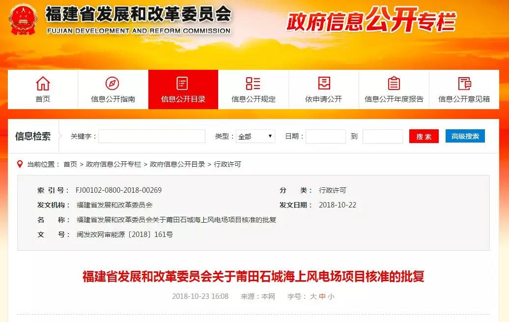 福建发改委核准批复莆田石城200MW海上风电场项目