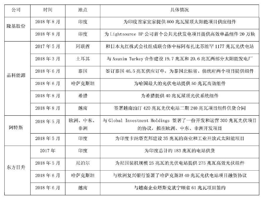 公共媒体以《路线图》提到的64个主要沿线国家为“一带一路”的路线蓝本,对隆基股份、晶科能源、阿特斯、晶澳、东方日升、协鑫集成、天合能源、阳光能源八家光伏企业在“一带一路”发展状况进行统计分析,以探索各家光伏企业布局“一带一路”的趋势。结果显示,目前,中国光伏企业在“一带一路”沿线主要活跃的区域为:越南、印度尼西亚、巴基斯坦、马来西亚、印度、马尔代夫、阿联酋、沙特阿拉伯、土耳其、哈萨克斯坦、乌克兰、俄罗斯、埃及、以色列等14国。其中,在印度、马来西亚、越南、巴基斯坦、哈萨克斯坦、阿联酋市场进行投资、合资建设、收购兼并、产品输出最为频繁。各企业中,隆基、晶科、协鑫集成、晶澳、天合光能5家企业重点布局在产业链上游和中游的生产环节,阿特斯、东方日升主推电站建设,阳光能源以开发光储一体化项目为主。
