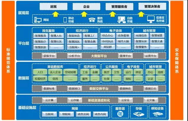 智慧江苏建设的总体架构包括基础设施层、数据层、平台层、展现层等四个层次和标准规范体系、安全保障体系等两个体系。展现层通过整合各种渠道,为市民、企业、管理服务者、管理决策者四类服务对象提供统一的访问和交互入口;平台层通过提供跨部门、跨行业的融合性服务应用,实现管理端的有序协同和服务端的有效反馈;数据层通过建设各类数据库、统一数据交换平台,实现数据资源的标准化、规范化;基础设施层通过集约化建设和云服务方式,合理灵活地分配基础设施资源。遵循国家各项法律法规和相关行业标准,构建智慧江苏标准规范体系,形成统一的信息化标准框架和面向各重点领域的行业信息化标准规范。打造涵盖技术、设施、管理、法规的智慧江苏网络安全保障体系,提升态势感知和应急响应能力,加强重要数据资源和个人信息安全保护,强化关键信息基础设施安全可控水平。