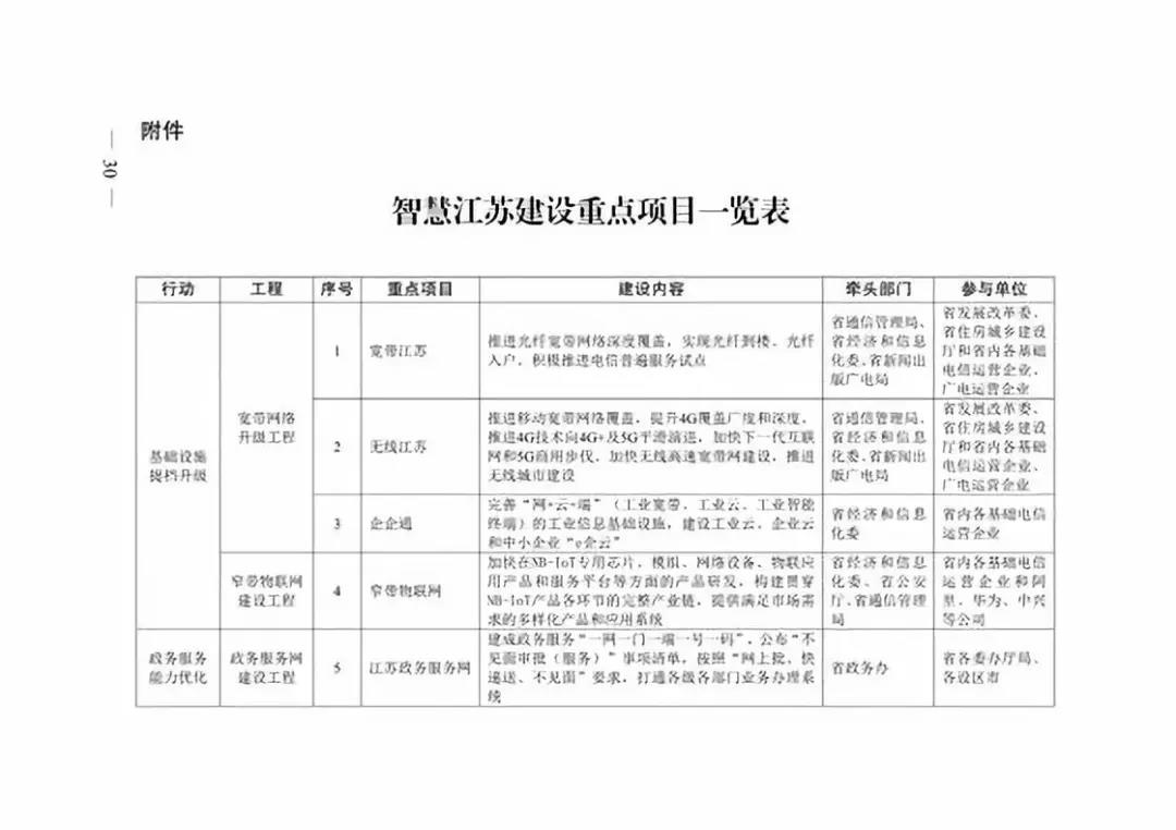 1.宽带网络升级工程。大力实施“光网城市”“光网乡村”工程,深入推进“企企通”工程建设。在南京国家级互联网骨干直联点基础上加大带宽扩容力度,加快互联网国际通信专用通道建设,打造面向区域级骨干网络互联的区域交换中心、信息交互中心。支持南京、苏州等下一代互联网示范城市建设,打造第五代移动通信产业化基地。加快国家广电骨干网江苏核心枢纽以及江苏地面数字电视覆盖网建设,全面推进“高清江苏”“4K江苏”。