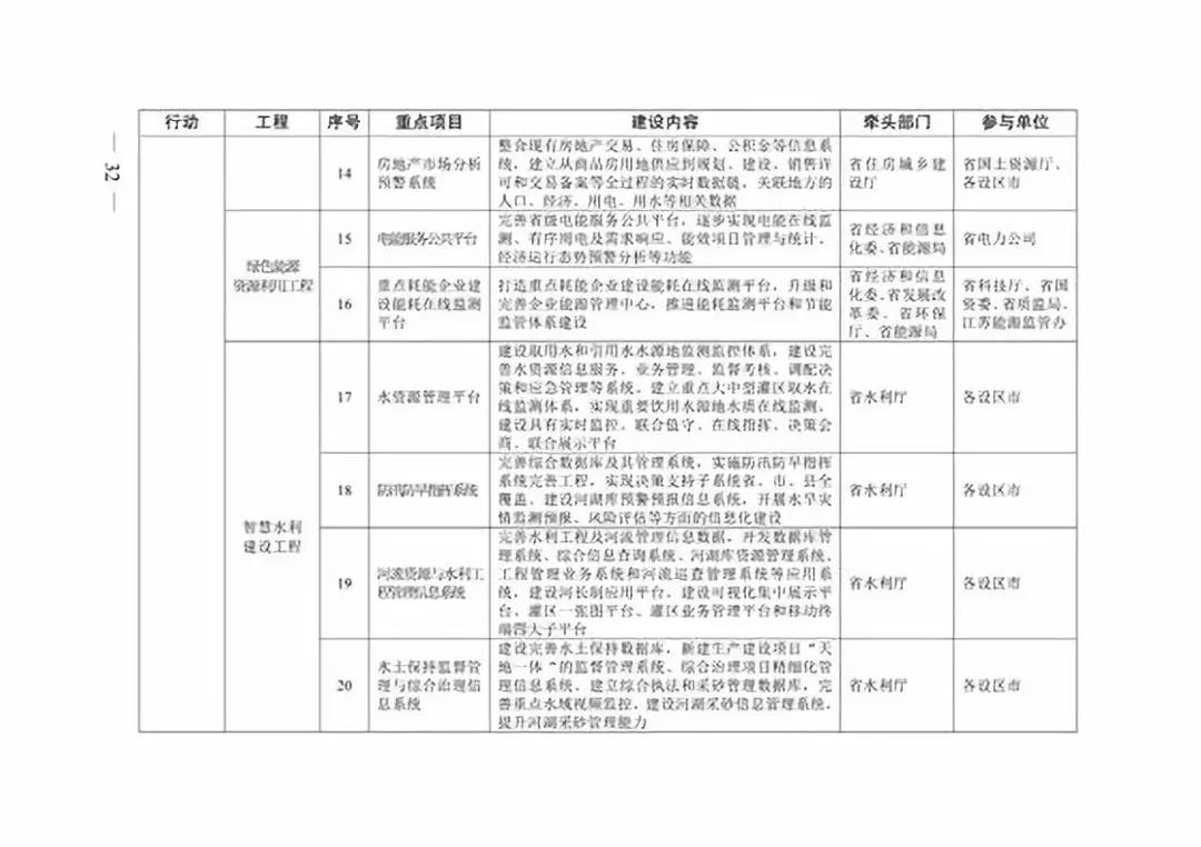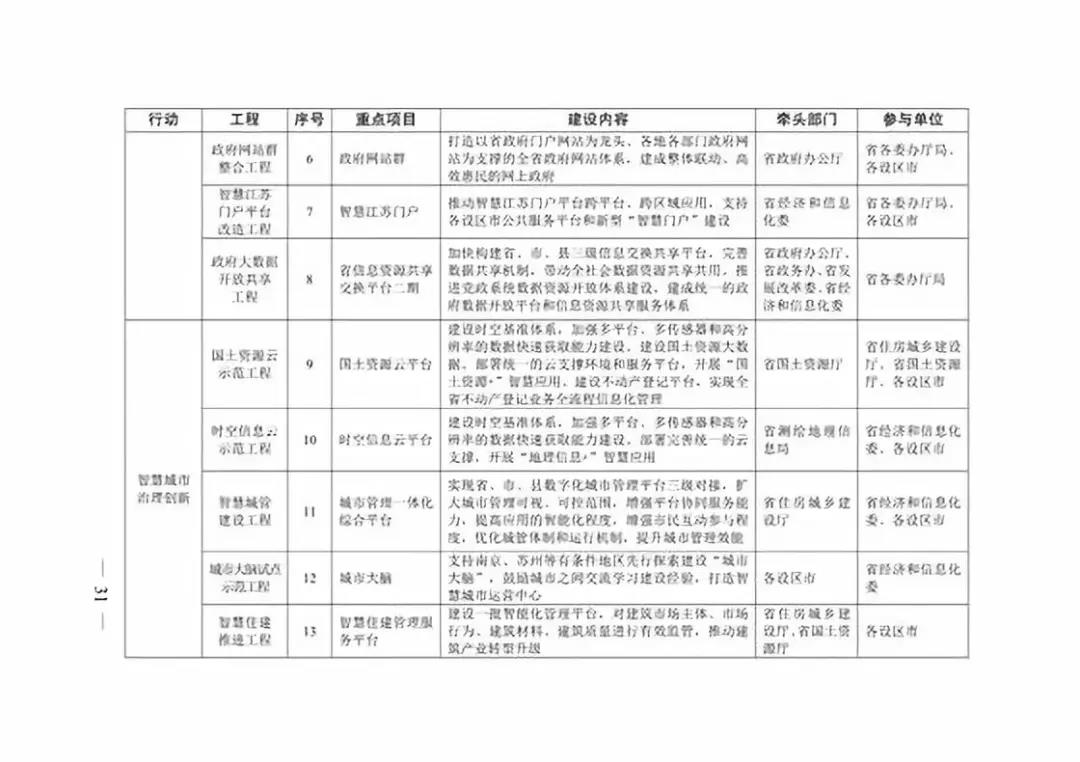 3﹒城市大脑。支持南京、苏州等有条件地区先行探索建设“城市大脑”,打造智慧城市运营中心。整合城市电子政务资源中心数据,接入通信运营商、基础设施运营商以及互联网企业等社会数据,形成城市大数据,通过对终端信息的全面感知和数据处理,构建完整的“智慧城市运行图”。
