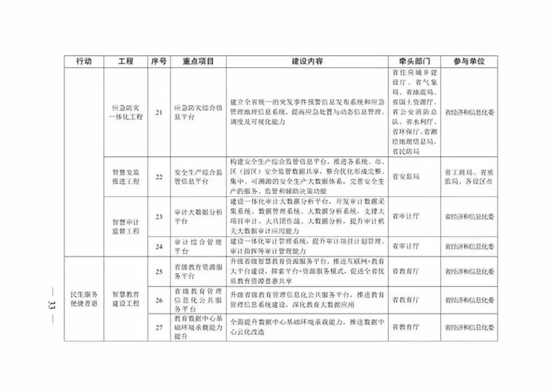 9.智慧安监建设工程。开发安全生产信息系统和事故应急技术支撑平台,优化整合安全生产信息系统,推进省级安全生产数据中心建设。建成覆盖省、市、县三级的安全生产信息网络,推进各级安监部门信息化建设,提升安全生产监管效能。