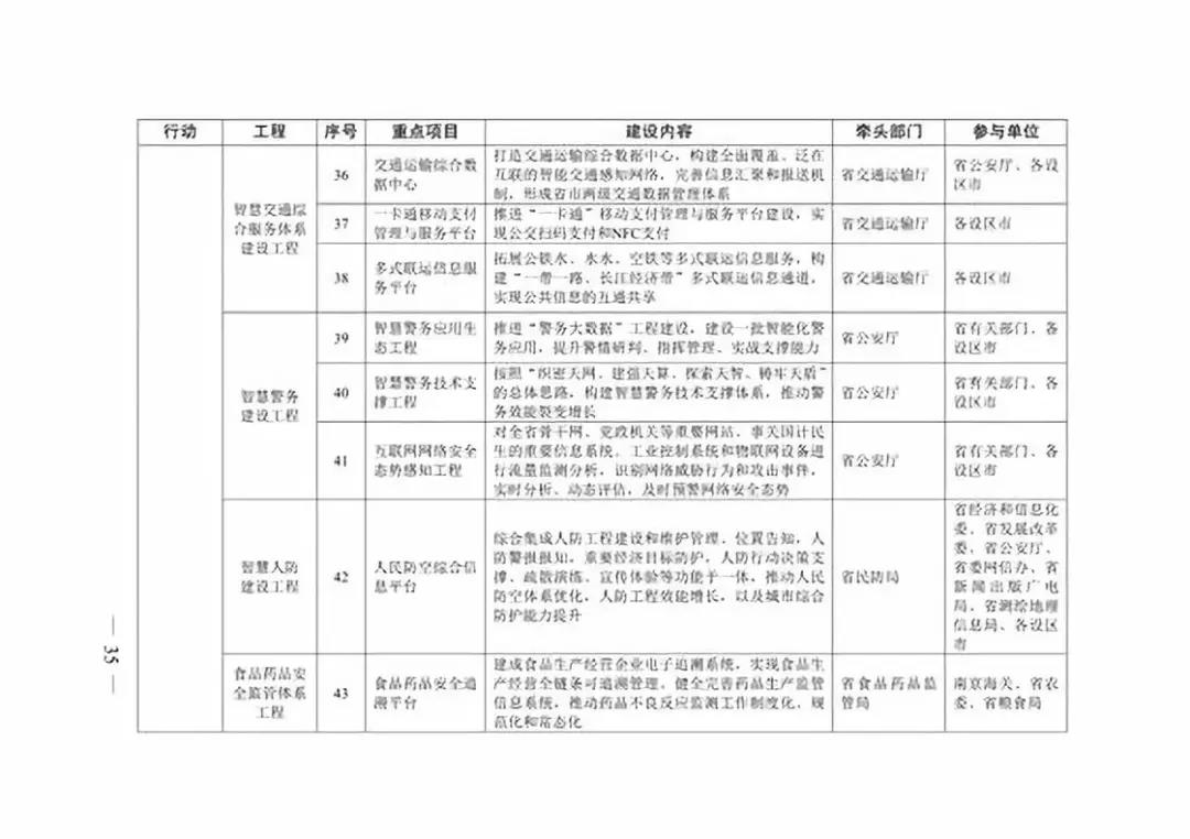 6.智慧交通建设工程。完善省、市两级交通运输综合数据中心和移动应用等基础平台。建设全面覆盖、泛在互联的智能交通感知网络,加快推广全省交通地理信息云服务平台应用。健全公众出行综合信息服务体系,加快推广掌上公交、公交智能调度系统、出租车管理与服务系统、渡船航行避碰预警导航系统。推进交通“一卡通”移动支付管理与服务平台建设。构建多式联运信息通道,推动交通物流协作。强化寄递渠道的安全监管和信息服务。