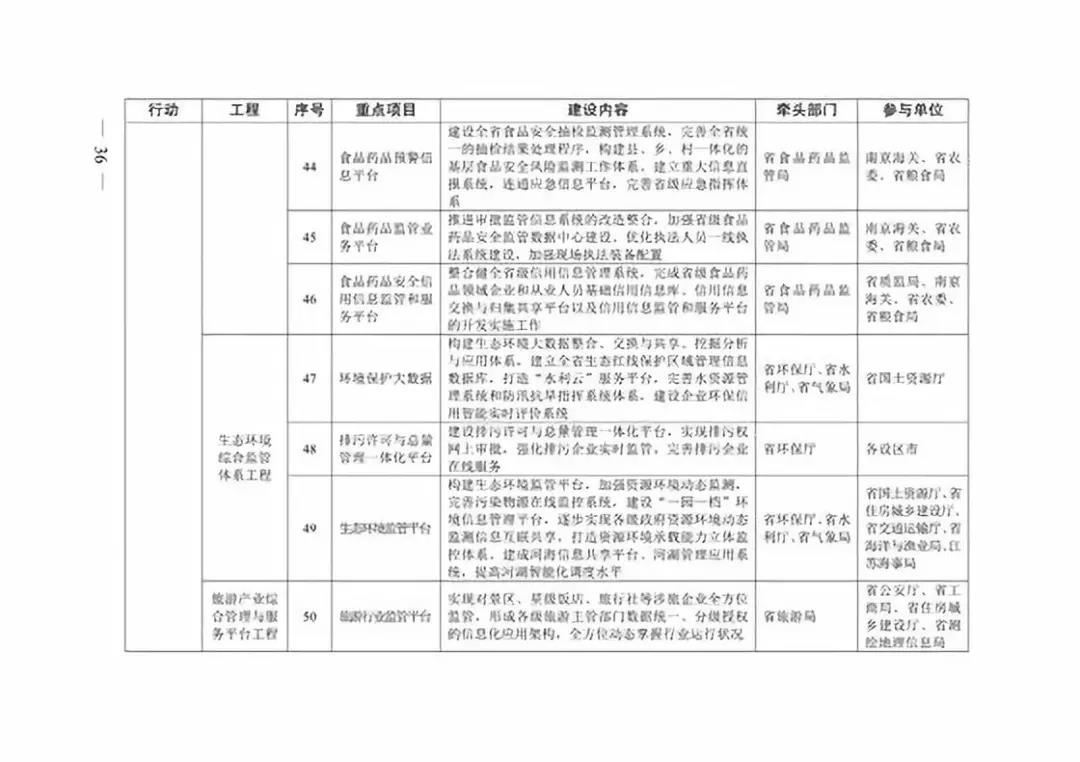 1﹒大数据应用推广计划。重点实施大数据新兴业态培育工程、信用信息系统建设工程、现代农业大数据工程、经济运行大数据工程、智慧交通大数据工程、警务大数据工程、市场监管大数据工程、人力资源社会保障大数据工程、健康医疗大数据工程、食品药品大数据工程、环境保护大数据工程、审计大数据工程和安全生产大数据工程。实施政府大数据资源共享开放工程,建设全省统一的“大平台、大数据、大系统”,加快构建省、市、县三级大数据共享交换平台。