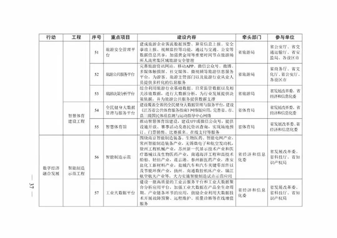 2﹒产业数字化。以信息技术与制造业深度融合为突出抓手,着力突破智能制造关键核心技术和装备,促进信息技术向设计、生产、市场等环节渗透,鼓励生产方式向精细、柔性、智能转变,推动产品高端化、智能化发展,成为具有国际影响力、国内领先的智能制造先行示范区。积极培育平台经济、分享经济、创意经济、智能经济等新经济形态,催生各类新技术、新产业、新业态、新模式。积极发展电子商务,扩大和升级信息消费。加快服务业网络化发展和智能化升级。打造一批具有国际或区域影响力的互联网交易中心,培育一批特色鲜明、竞争力强的互联网品牌企业,建设一批功能完备、配套完善的互联网经济集聚区。打造一批智慧园区和创新型园区,积极深化苏州工业园区开放创新综合试验,推动南京江北新区、中韩盐城产业园、连云港中哈物流园区等平台载体建设。推动南京未来网络小镇、无锡鸿山物联网小镇、新加坡·南京生态科技岛等一批小城镇智慧化发展。加快智慧农业建设步伐,积极运用现代信息技术改造提升农业,发展生态优、村庄美、产业特、农民富、集体强、乡风好的江苏特色田园乡村。