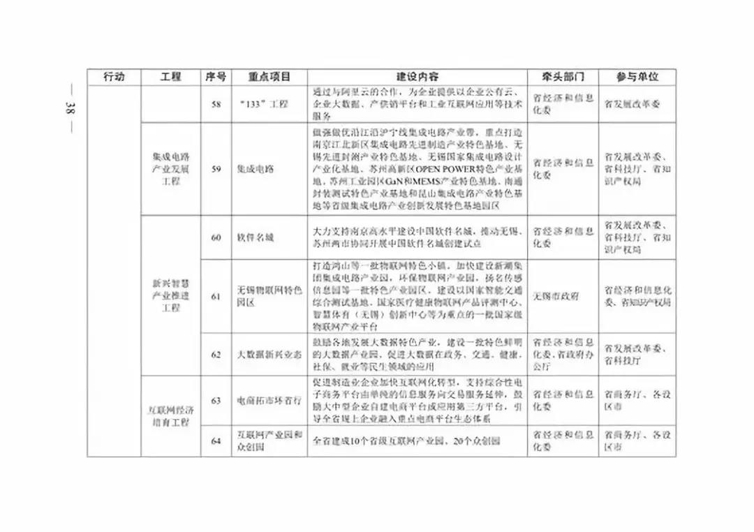 1.新兴智慧产业推进工程。研究推动工业大数据、工业云服务平台、工业互联网支撑软件等领域的关键共性技术创新。创建大数据开放共享与应用试验区。实施“数动未来”专项行动,遴选一批优秀云计算大数据应用示范项目,加快云计算、大数据领域重大标准研制和应用推广。大力推进中国软件名城建设,推动苏南、苏中、苏北软件产业园区优势互补、创新合作,实现错位发展、联动发展。推动国家传感网创新示范区建设,加快推进汽车电子标识、智能交通等一批重点物联网应用示范,打造物联网产业发展新高地。研发自主安全可控服务器、智能终端、可穿戴设备、智能汽车、智能家居设备、工业机器人等一批能够成为互联网新入口的智能硬件。加快发展人工智能软硬件产业,积极培育人工智能平台和服务型企业,建立完善人工智能产品、技术和应用协同发展机制。