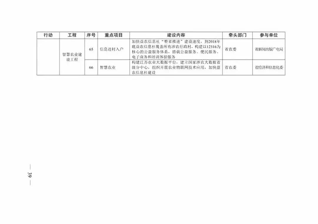 6.智慧农业建设工程。大力推进物联网技术在农业生产领域的全程应用,积极发展精准农业、智能农业,推动农业生产智能化。启动江苏农业大数据平台建设,推动数据融合、业务融合和服务融合,逐步形成覆盖全省、统筹利用、统一接入的数据共享平台,推动农业大数据挖掘应用,全面构建智慧农业生产经营服务体系。提升信息进村入户工程整省推进示范省建设水平,促进公益、便民、电子商务、培训体验四项服务不断深化。