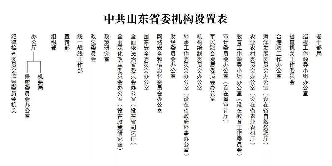 中共山东省委设置纪检监察机关1个,计入机构限额的工作机关15个(设在相关部门的省委议事协调机构的办事机构不计入机构限额)。其中,纪律检查委员会与监察委员会合署办公,实行一套工作机构、两个机关名称;办公厅挂省档案局牌子;组织部挂省公务员局牌子;宣传部挂省新闻出版局、省版权局、省政府新闻办公室、省精神文明建设委员会办公室、省电影局牌子;统一战线工作部挂省政府侨务办公室牌子;台港澳工作办公室挂省政府台港澳事务办公室牌子;网络安全和信息化委员会办公室挂省互联网信息办公室牌子。教育工作委员会与省教育厅合署办公,不计入机构限额。