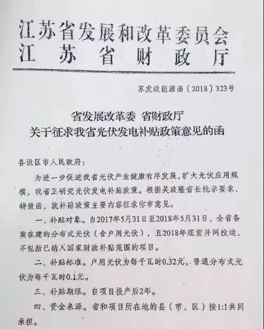 附:江苏省发改委和江苏省财政厅联合发布的《关于征求我省光伏发电补贴政策意见的函》: