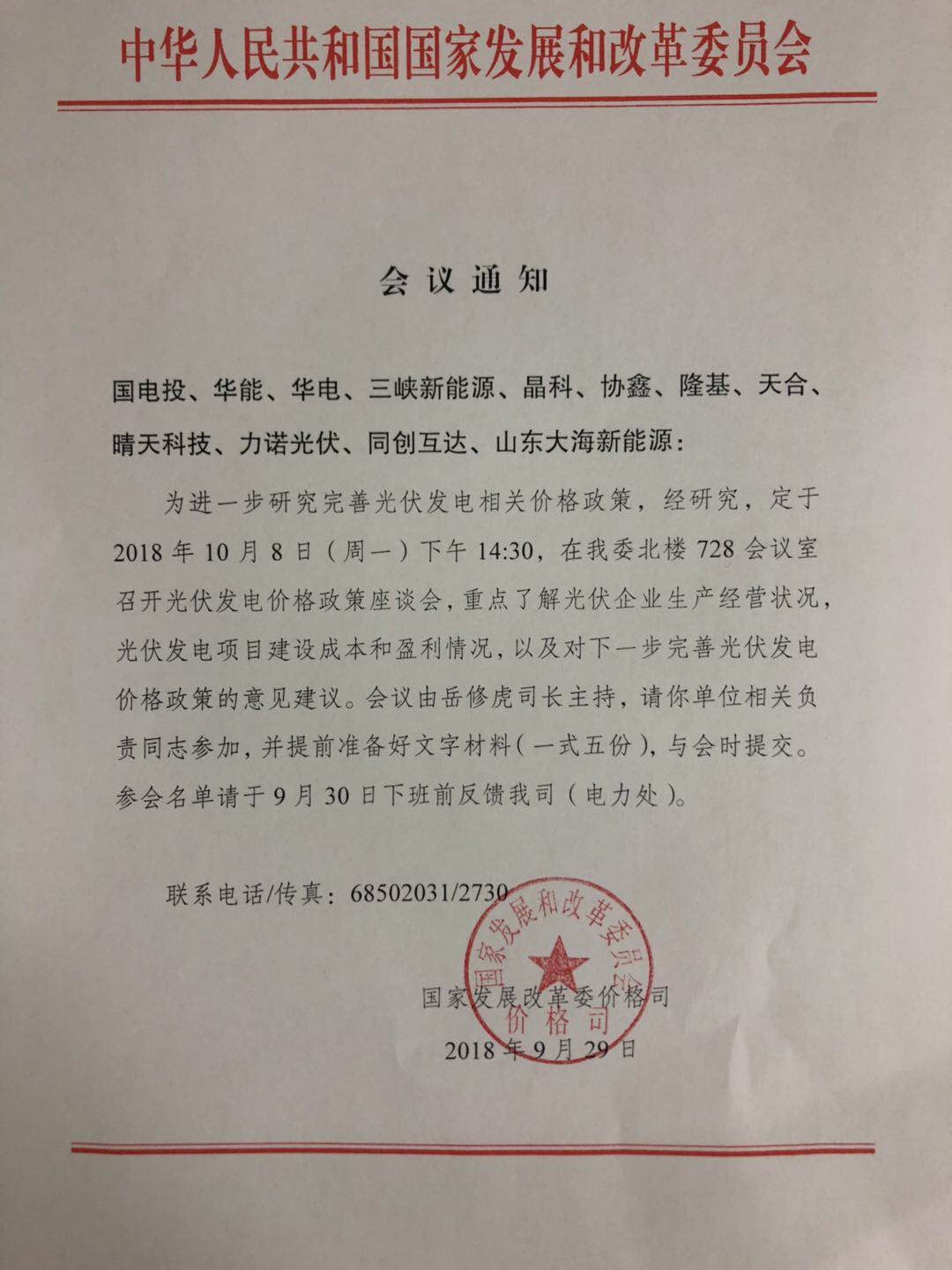 国家发改委价格司9月29日发通知称,将于10月8日下午组织光伏企业召开光伏发电价格政策座谈会,重点了解光伏企业生产经营状况,光伏发电项目建设成本和盈利情况,以及对下一步完善光伏发电价格政策的意见建议。