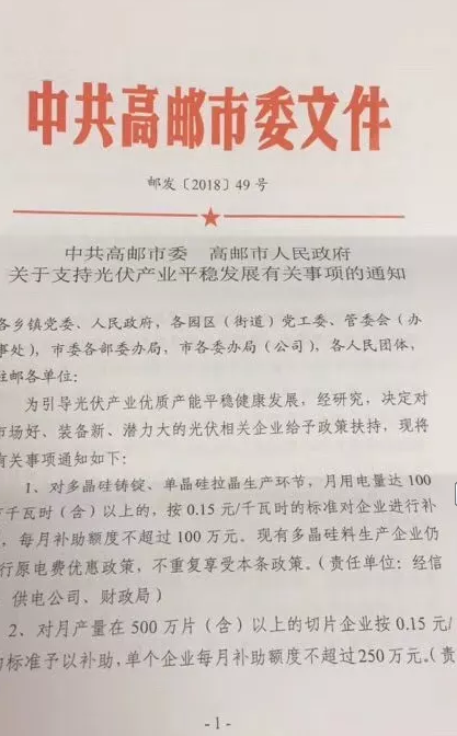 江苏高邮光伏好声音:对多晶硅、硅片等光伏制造企业给予补助